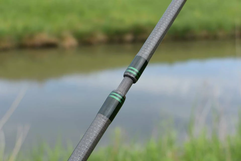 Deze hengels zijn uitgevoerd met 12 ogen & topoog, de wikkelingen zijn donkergroen waarbij de wikkelingen rond de sluiting en de wikkelingen boven de kurken greep zijn uitgevoerd met lichtgroene accenten.
