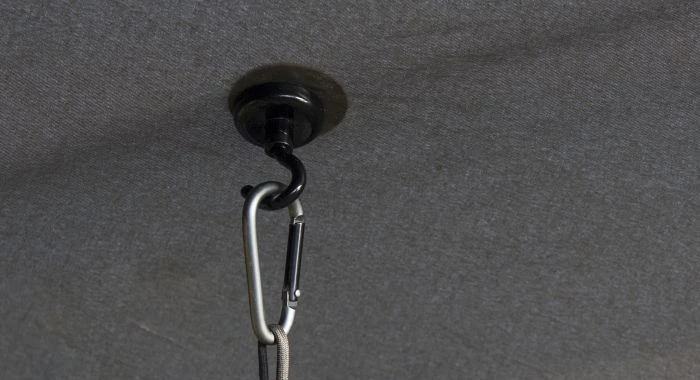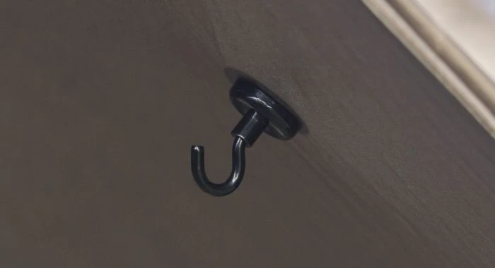 High strength magnetic hook to attach head torches, phones and other accessories to the inside of bivvies or umbrellas.